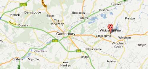 Head towards Sturry and turn left for Fordwich. Turn left at Stodmarsh Road and make for Wickhambreaux. When you reach Wickhambreaux, you will see The Rose Inn on your left hand side. Keep going, passing a white Mill on your right hand side. 50 metres from the Mill you will see a junction on your left sign posted Wickham Lane. Travel up it till you reach the corner at the end. Before the corner will be the TOR junction on your left. Turn left down the gravel driveway.